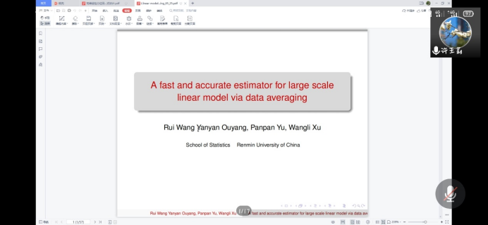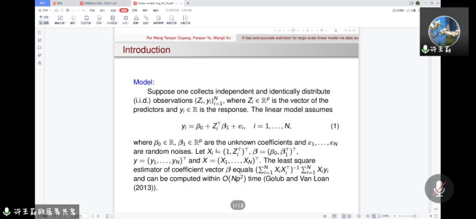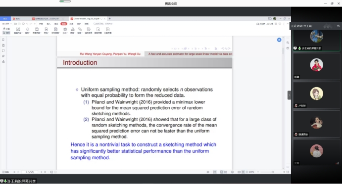 报告会中,中国人民大学统计系教授首先讲解了样本量极大且数据维数随样本量变化时线性模型的估计问题。许教授表示在这种情况下,基于完整数据的最小二乘估计在有限的计算资源下是不可行的。现有的许多方法都是基于概念性的。接着许教授展示了其推导的用于概念方法的条件均方误差的下界。然后,许教授向我们介绍了一种基于数据平均的采样方法,提供了一个可达到的最佳收敛速度。该方法将原始数据简化为几个平均观测值。这些平均观测值仍然满足线性模型,并用于估计回归系数。最后研究了所提出的估计方法的渐近性。使大家对于数据平均的采样方法的高效性有了更加深入的了解和兴趣。