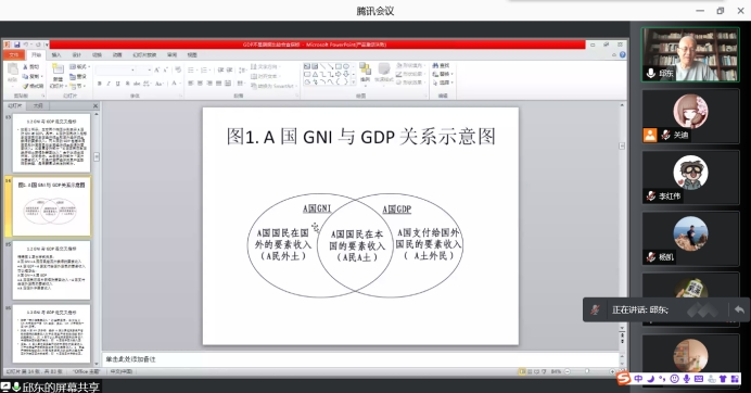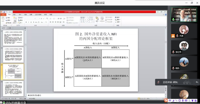 报告会中,邱东教授讲解了1990-2019年30年来“国外净要素收入”在全球各国的分配情况,并进一步说明了美国的NFI盈余占全球40%,占据全球第一,中国的NFI赤字随着GDP增大而急剧快速增大。最后邱老师还讲授了新兴经济体GDP增长与NFI赤字存在加大的剪刀差趋势。
