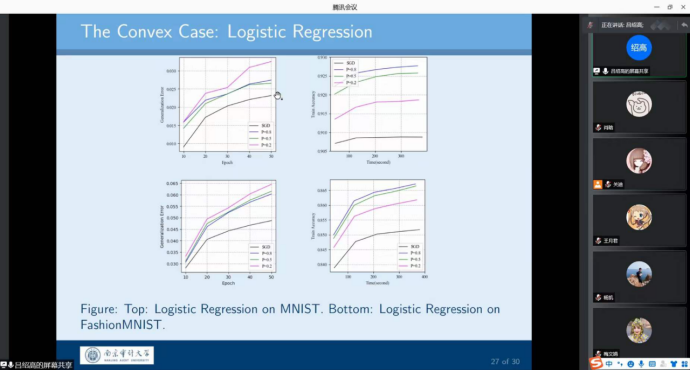 报告会中,吕绍高老师分别从理论背景,带有量化的分布式SGD的原理以及模拟实验等几个方面讲述了对广泛使用的带有量化的分布式SGD的一些关键因素之间的相互作用,包括量化水平、优化误差和泛化性能,为师生们做了一场精彩的学术报告。理论结果表明,对于凸目标,在通信效率、优化误差和泛化性能之间存在着一些权衡,对于非凸目标,其量化水平对概括能力有更大的影响。在非凸的情况下,得出的泛化界限也表明,即使SGD的步长非常小,也可能需要早期停止来保证一定的泛化精度。最后,吕绍高老师介绍了使用逻辑模型和神经网络进行了几个数值实验,以支持理论结论。