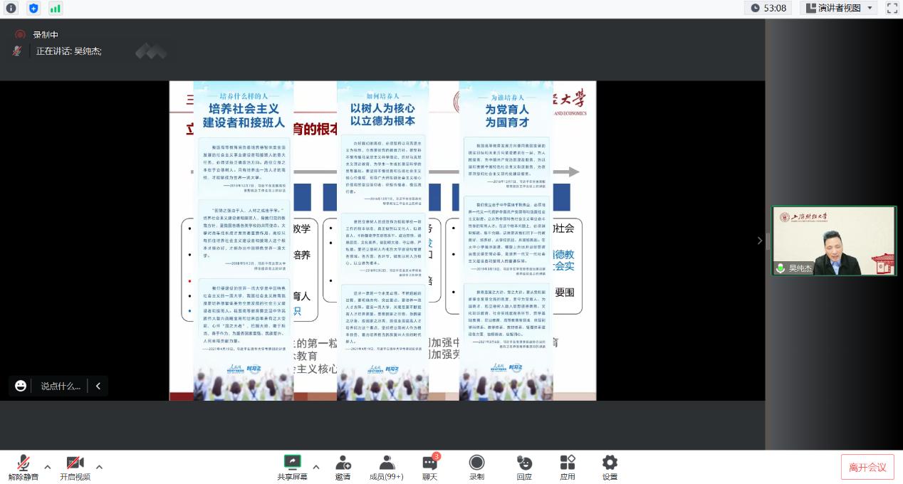 吴教授首先对于课程建设的背景做了细致的介绍。并且引用了一些国家下达的文件来说明建设精品课程的重要性与必要性。吴教授说明了自己对于统计与管理学院课程建设的成效。吴教授讲述了自己在申报过程中的感悟,向大家详细地介绍历程和取得的成果,为我院的学科课程建设有鼓励和指导作用。吴教授指出:进行课程思政建设要围绕着三个问题展开:培养什么样的人、如何培养人以及为谁培养人。
