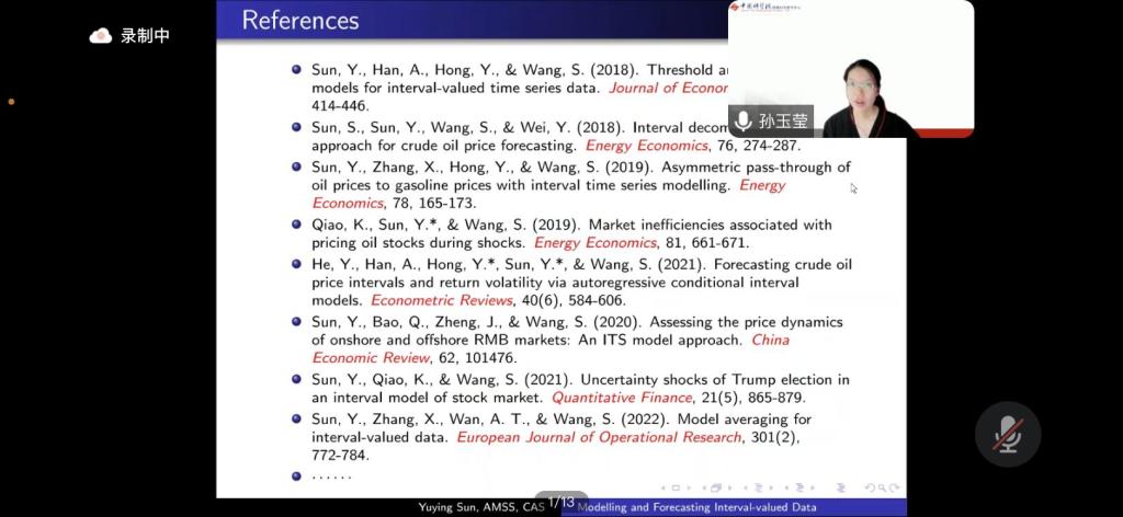 孙老师从区间数据的实际例子切入,详细介绍了区间数据的起源、发展、应用场景、建模策略和推断方法等问题,并指出了区间数据未来研究的发展方向。