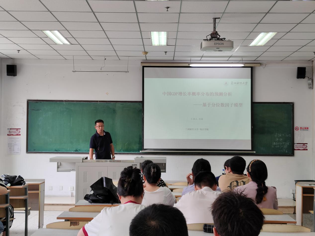本次会议,肖强教授通过研究背景,生活实例,文献综述等方面向我们讲解了基于分位数因子模型。首先向我们介绍了本次会议涉及到的名词的概念,如动态因子模型,分位数因子模型等相关知识,接着又在黑板上利用数形结合的办法,让我们对基于分位数因子模型知识有了更进一步的认识,其次还给我们普及了各个领域中涉及到的统计知识和取得成绩的一些名人,还从不同的角度,分享了自己的研究经验和学习方法,为我院师生提供了宝贵的参考和借鉴。接着肖强教授用专业和简洁的语言对本次会议做出了讲解,最后部分同学向肖强教授提出了自己的想法的疑问,肖强教授都一一详细且认真的给出了答案。