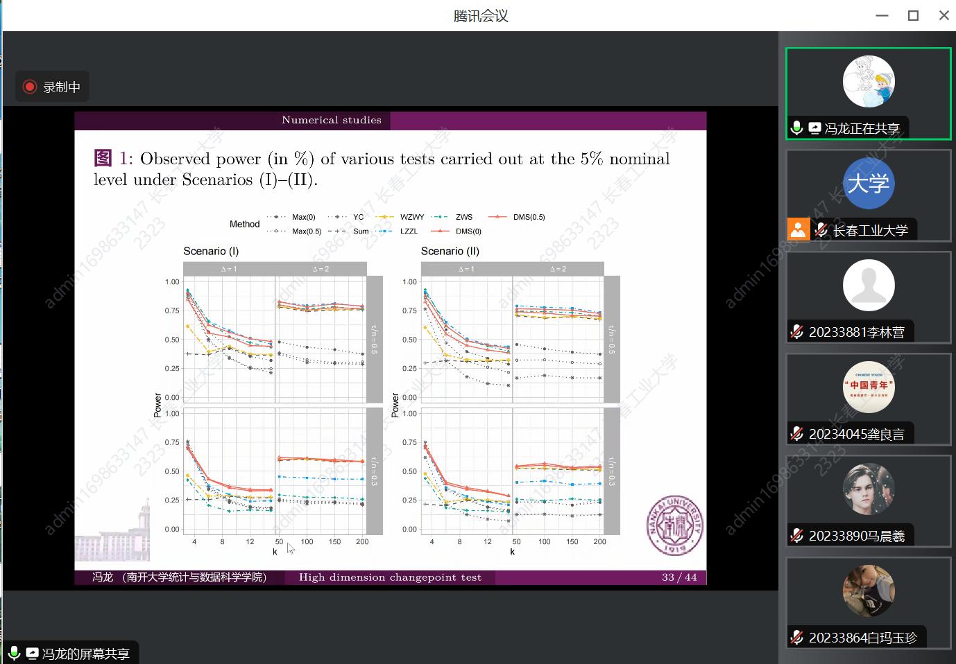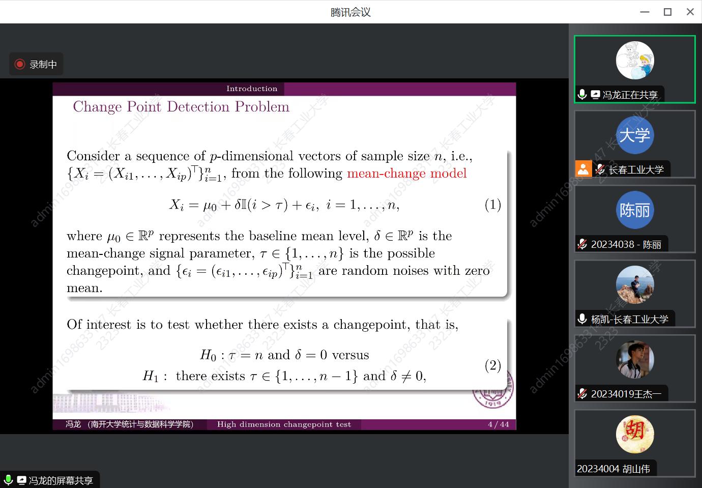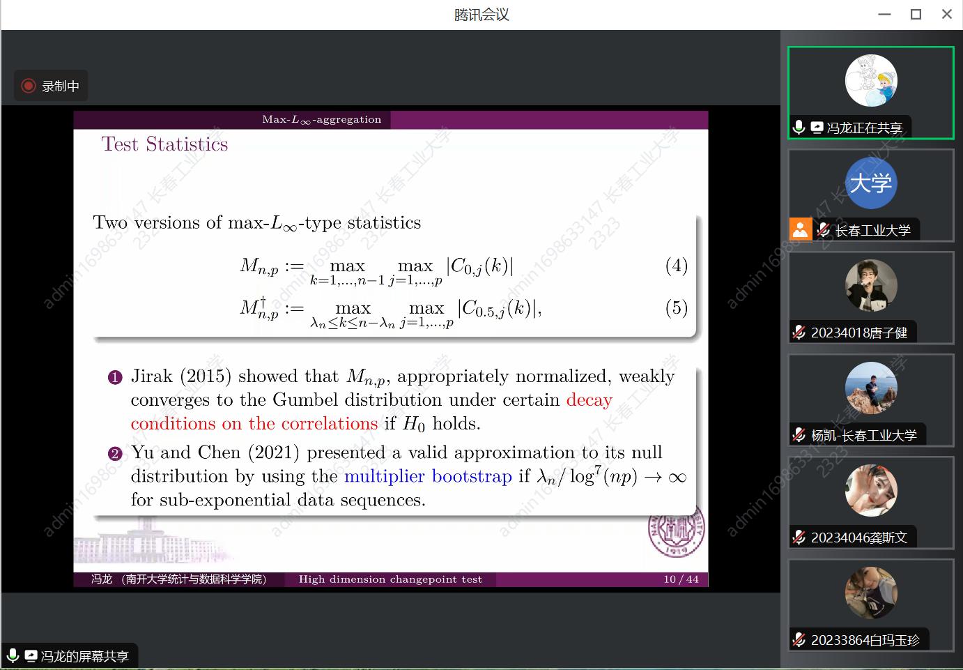 报告会中,冯老师主要介绍了高维变点问题,从一维的变点问题推广到高维变点,从max和稠密情况两点出发,对高维变点进行了阐述。冯老师讲到了在现实中模型是有很多变点的,可以做各统计量的联合分布,再针对变点问题做讨论。在实际操作中,高维是比较难的,而我们可以简化,将高维变到一维以便于进行研究。