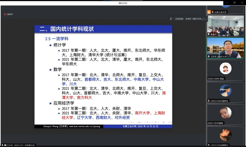 王兆军教授为我们介绍了国内统计学科现状,介绍了统计学在本科、硕士、博士的课程体系、研究方向、学生人数等情况,一流学科在各大高校的分布、本科专业情况,以及统计学界顶刊论文发表情况等。
