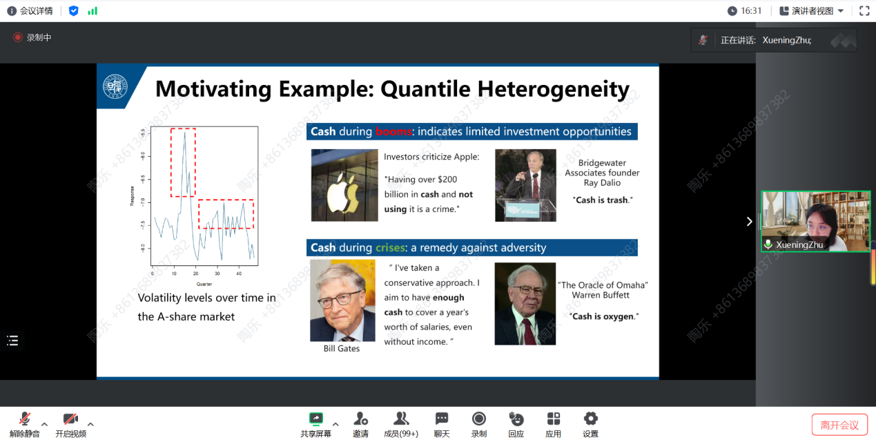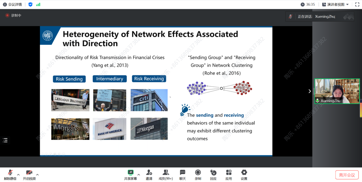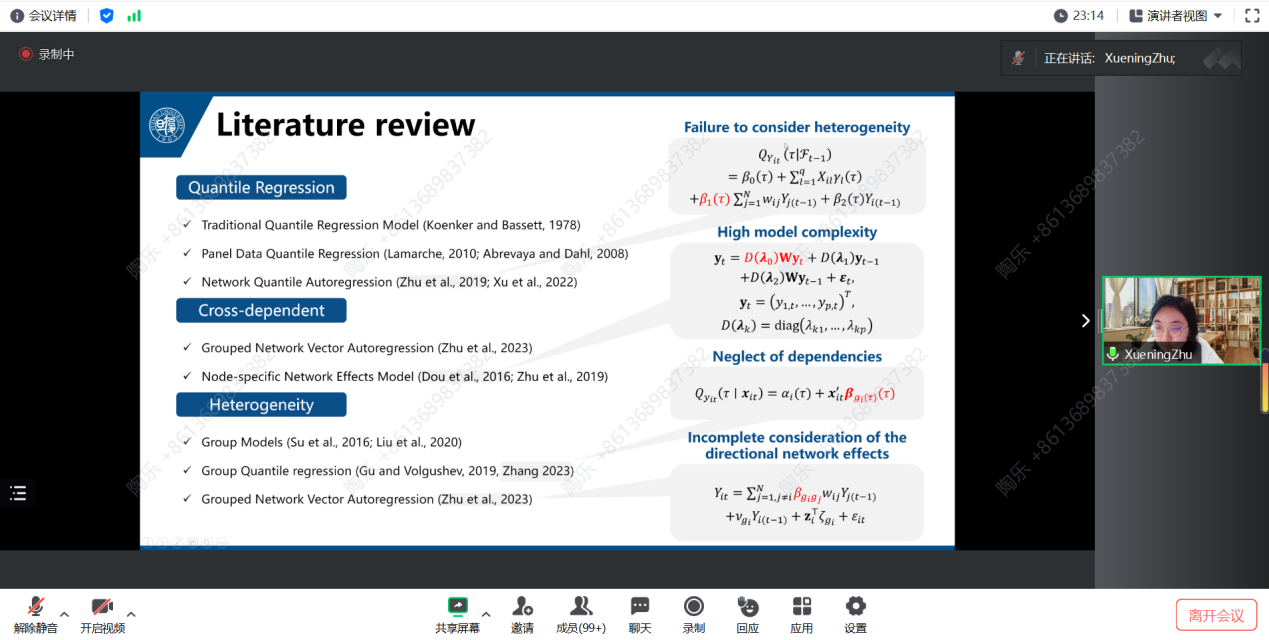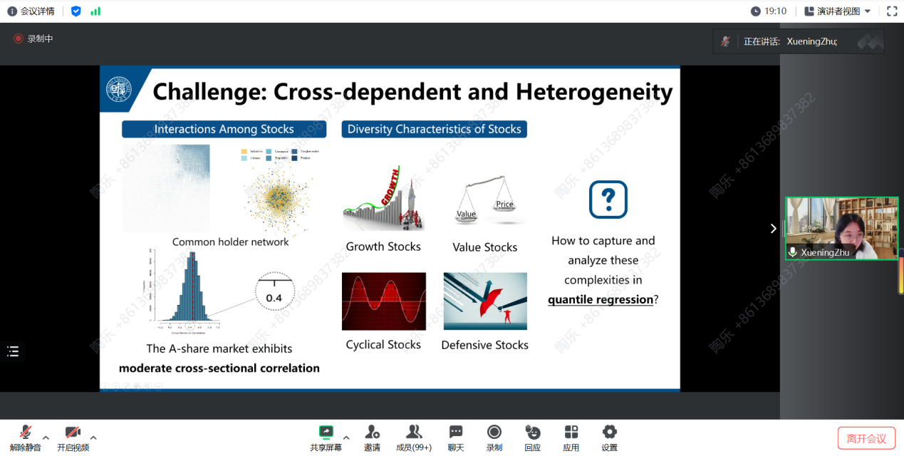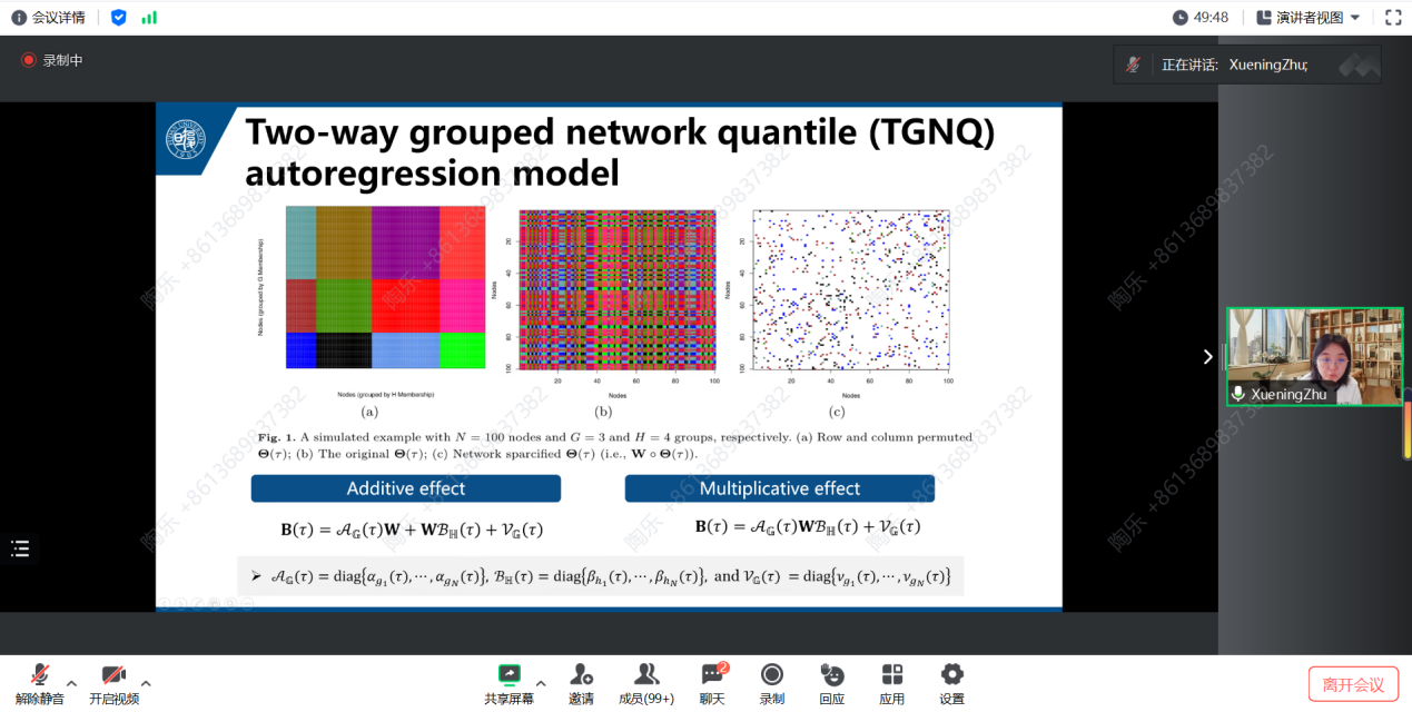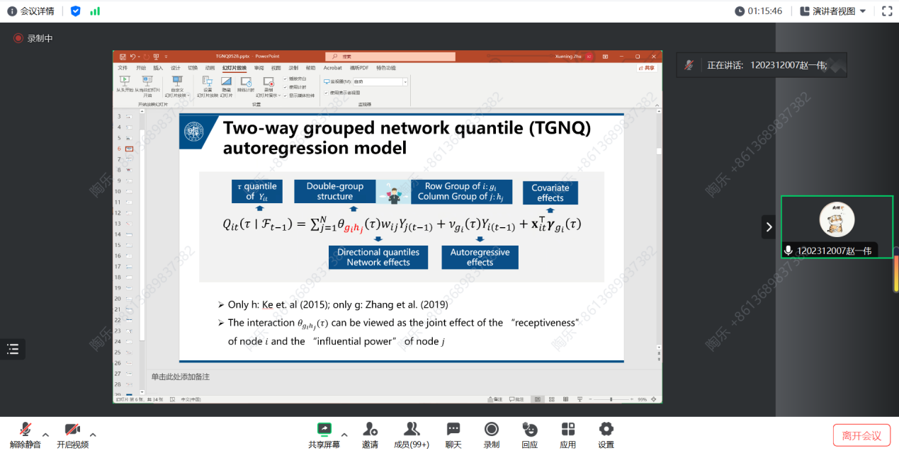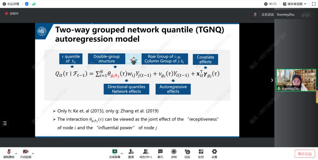 在报告中,朱雪宁教授先是通过生动的示例引入主题,深入浅出地解释了量子异质性。同时指出,向量自回归模型在复杂时间序列建模方面受到广受关注,但分位数自回归分析在高维时间序列数据中的应用却相对较少。为解决这一差异,朱雪宁教授引入了在大规模网络上收集的时间序列的TGNQ自回归模型。此模型因显著的节点间异构和定向交互,从而平衡了复杂性与可解释性。