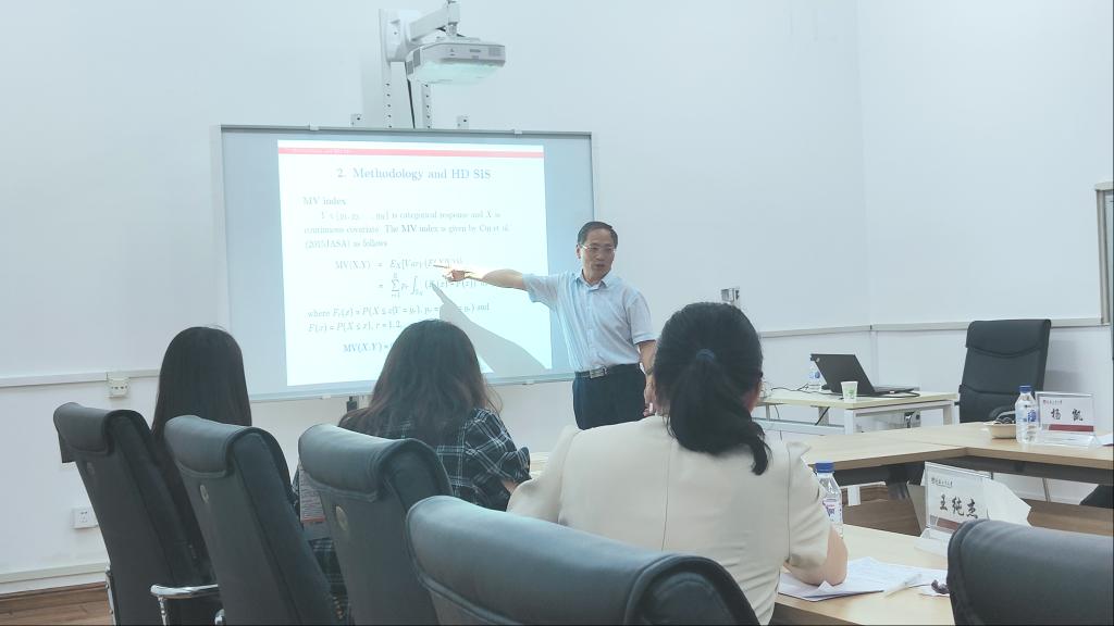 会上,崔恒建教授分享了最新研究。介绍了一种基于Hellinger距离的综合无模型特征筛选算法。研究表明,该算法在重尾和偏斜数据中表现出较强的竞争力,同时与现有的轻尾数据方法保持着一定的可比性,其在一系列数据中仍具备鲁棒性。在实例数据包含离散响应变量和连续响应变量两个示例上,均说明了所提算法的有效性。