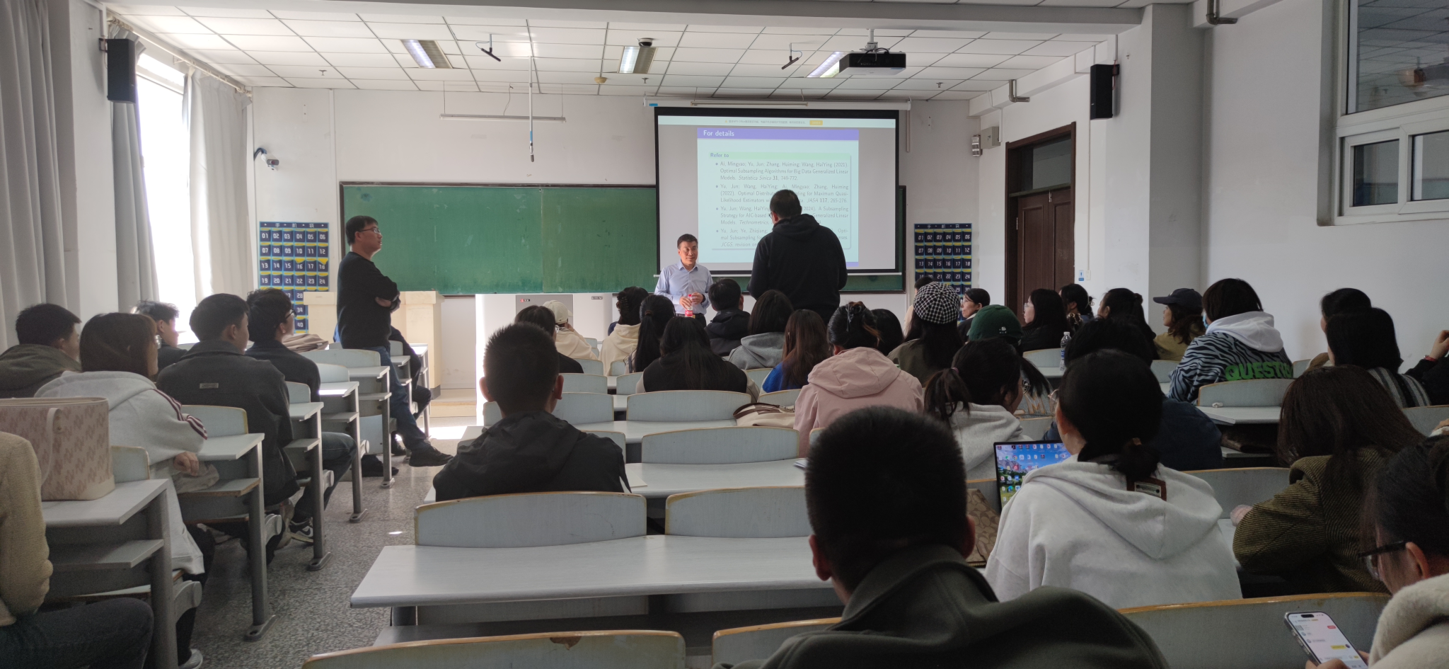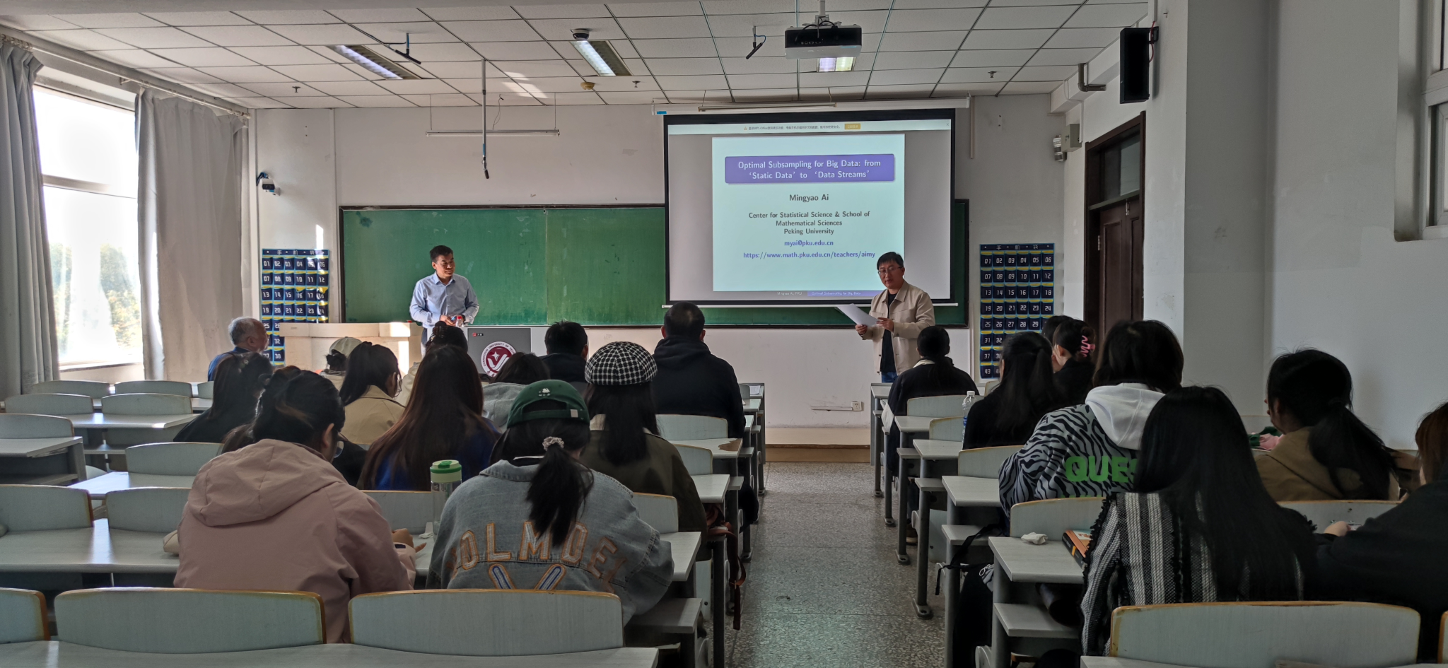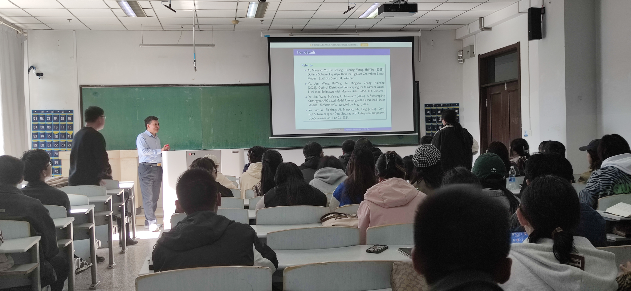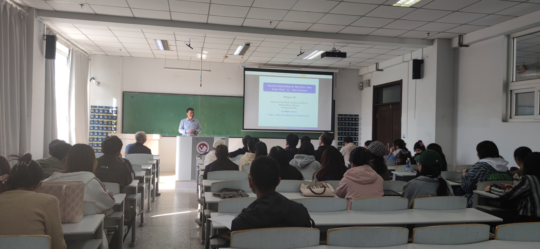 报告会中,艾教授主要介绍了大数据的最佳子抽样:从 “静态数据 ”到 “数据流”的相关问题。艾教授通过四篇文献讲解了有效处理不同类型大数据的不同子抽样技术,这些技术不仅适用于从线性模型、广义线性模型到估计方程的不同推理模型,还适用于从静态数据到数据流的不同数据类型。子抽样方法的优点是减轻计算负担、保持大数据统计推断效率的有效技术。为了应对完整数据存储在不同区块或多个位置的情况,开发了分布式子抽样框架,在该框架中,统计信息将同时在完整数据的较小分区上进行计算。