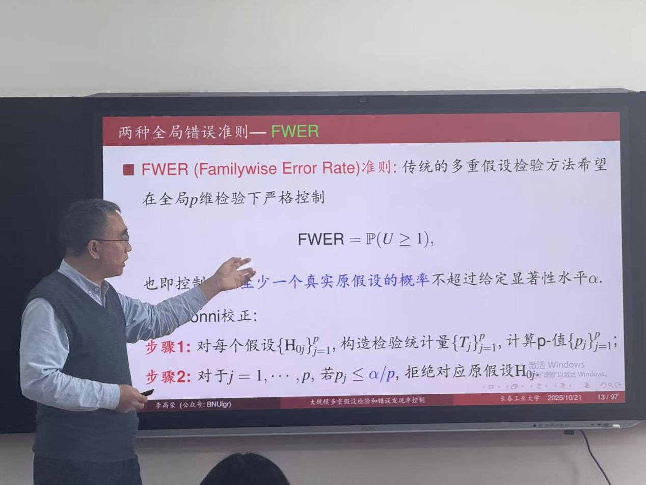 报告伊始,李高荣教授明确了大规模多重假设检验的核心场景与挑战。李教授指出,在DNA微阵列分析、临床实验、高维回归等领域,研究者常需同时检验成百上千个假设──例如在基因表达分析中,需对6033个基因分别检验其是否具有显著影响,传统单一假设检验方法易产生大量假阳性结果,如何平衡“错误发现”与“有效识别”成为核心问题。报告通过清晰的四象限分类表,界定了多重检验中的两类错误:U(错误发现/假阳性)与S(假阴性),并引出两种全局错误准则FWER与FDR。