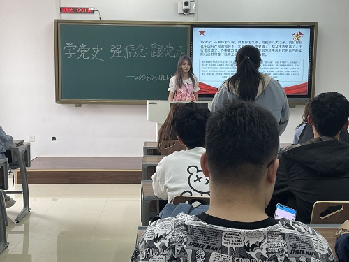本次团会深入贯彻并认真学习了党的十九届二中、三中、四中、五中全会的重要精神,习近平总书记在党史学习教育动员大会上的重要讲话精神,进一步领会习近平新时代中国特色社会主义思想的精髓,在理论学习中不断地增强“四个意识”、坚定“四个自信”、做到“两个维护”。200803班团支书邹晶洋在团会上通过讲述党的光辉历史,带领同学们学习并感受到了中国共产党的伟大,党员先辈和当代优秀党员榜样的初心使命及精神品质,号召全体团员为全面建设社会主义现代化国家、实现中华民族伟大复兴的中国梦贡献青春力量。