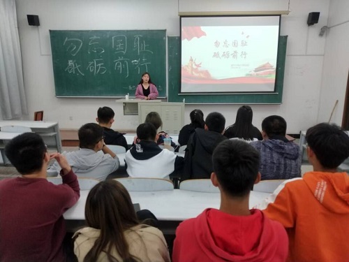 团委于2019年9月18日在教图楼209教室举行以“勿忘国耻,砥砺前行”为主题的纪念“九一八”主题团会。本次会议由组织部副部长林思扬主持,18级全体学生干部参加了此次团会。