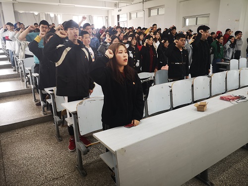 活动在嘹亮的团歌声中拉开了序幕。首先,林思扬用一段视频向团员们展示了“五四运动”的背景、历史意义及时代影响,她通过讲述罗家伦于“五四运动”期间的心理活动及行为意识,让团员们深刻的感受了“五四”精神,同时,也向全体团员们介绍了团章的主要内容等。影片结束后,由180802班吴遥卫同学带领团员们进行了庄严的宣誓。随后,团委组织部副部长盖梦琳以优秀团员的身份为新团员戴团徽,并向团员作出寄语:“做为一名大学生,同学们要时刻鞭策自己,刻苦学习,勤于实践,敢于探索,将国家的兴衰荣辱作为自身奋斗的终极目标,不辜负党和国家的培养,书写无愧于自身、无愧于国家、无愧于时代的青春。”
