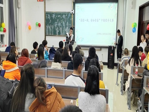 于2019年11月15日晚18时30分在主楼315教室举办了主题为“高歌一曲,安如青春”歌唱比赛活动。2019级学生李星晰、蒋石磊、等七名同学参加比赛,吕丹阳,陈晗同学担任赛会主持人。