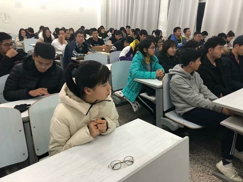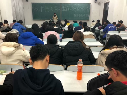 在教学楼309教室举办了双十佳大学生经验交流会。校第十九届十佳自立自强大学生胡宇婷为我院全体18级同学送上一场生动而励志的精彩报告。