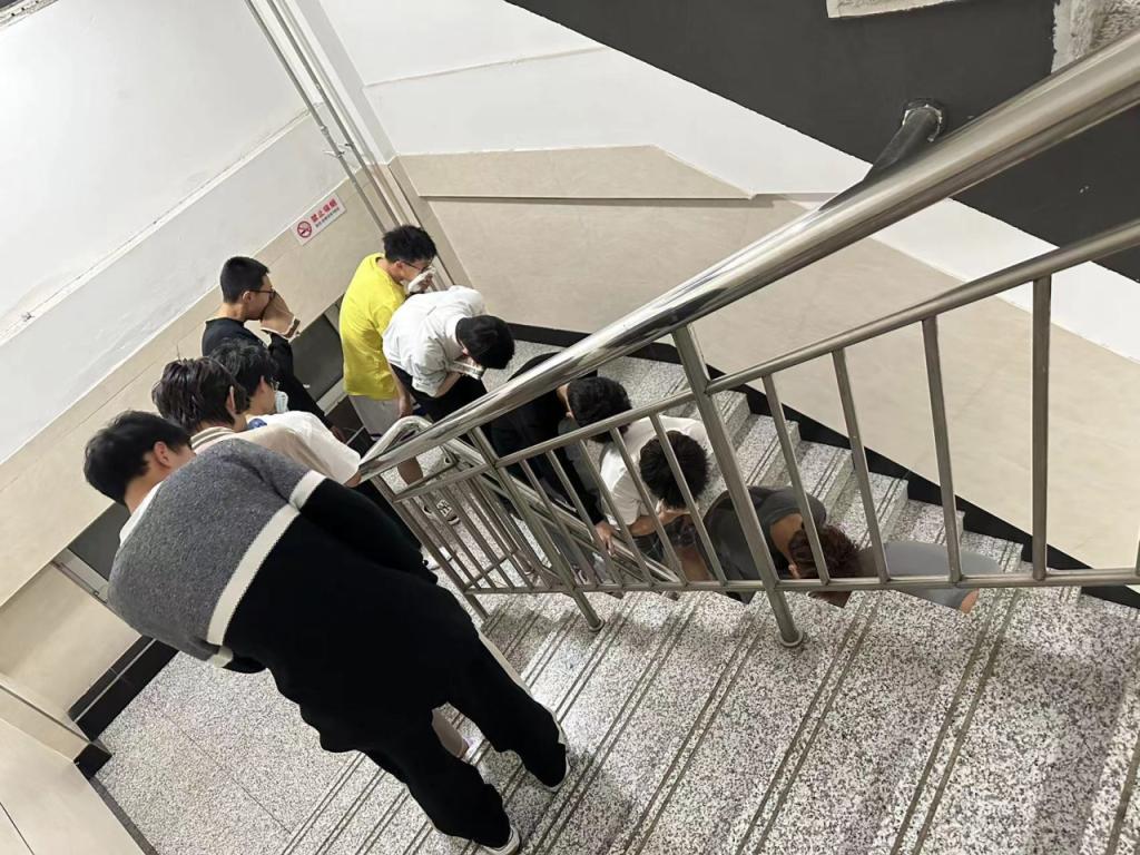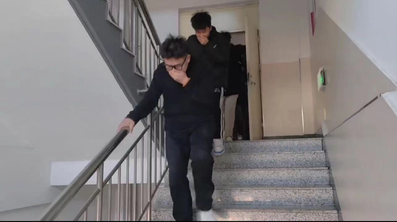 宣讲结束后,学生会组织全体同学在教学楼内进行了消防安全演练。演练过程中,学生们听从指挥,用湿毛巾捂住口鼻,有序进行疏散。