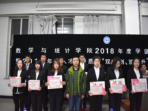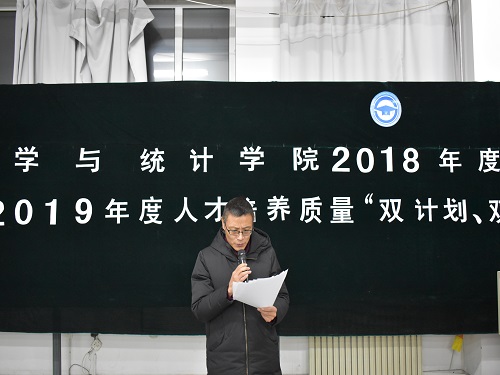 2018学年学团表彰表彰大会暨2019年度人才培养质量“双计划,双提升”工程启动仪式,学院党委书记朱宏伟、院长王纯杰、党委副书记王丹、副处级专职组织员兼研究生辅导员应艳、团委书记郑岩、应用数学系主任刘铭、统计系党支部书记李纯静出席了本次大会,2017级、2018级全体同学及受表彰的研究生和本科生个人与集体代表参加大会,会议由团委副书记崔仕贤同学主持。