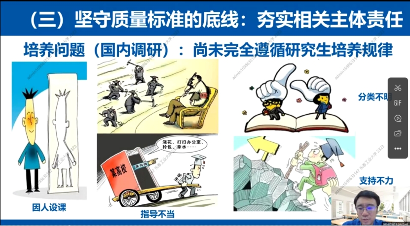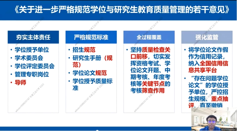 (通讯员:关迪)为贯彻落实习近平总书记关于研究生教育工作的重要指示精神,落实研究生导师立德树人根本任务,提升研究生导师教书育人能力素质,切实保障免费A片 研究生培养质量,促进学校研究生教育事业高质量发展。根据《教育部关于全面落实研究生导师立德树人职责的意见》(教研〔20181号)、《免费A片 研究生指导教师培训管理办法》(研字〔20227号)等文件精神,免费A片 于2024519日上午830分,第二期培训班在线上如期举行,学院副院长杨凯副教授主持会议,学院全体研究生指导教师参加了本次培训。本次培训由清华大学王传毅老师讲述面向新时代的中国研究生教育改革:近三年研究生教育重大改革政策解读。