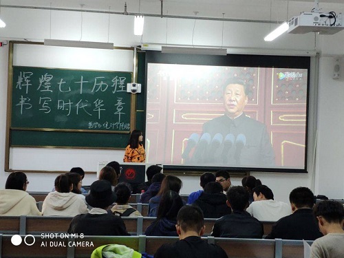 于2019年10月23日下午在主楼446教室开展了“学习筑梦”系列活动之“辉煌七十历程,书写时代华章”主题团会。本次活动由180802班团支书张宁馨主持,大一、大二全体团支部委员参加本次活动。