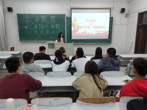 团委讯(通讯员:高帅帅 桂尚珂)为了纪念建国七十年,激励我院学生干部以实现民族伟大复兴为己任,提升自身素养、不断开拓视野,我院于2019年9月17日晚6点30分在教图楼209教室开展了以“建国七十载,共筑新时代”为主题的“学习筑梦”活动。18级全体学生干部参加此次活动,会议由180802班团支书张宁馨主持。